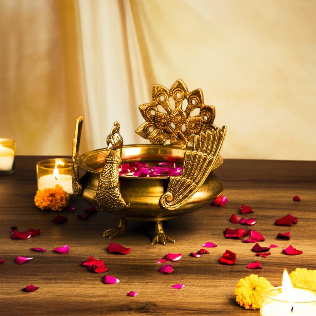 Skilfully handcrafted depicting the Indian traditional design, this stunning antique Peacock Urli is made up of top-quality brass. Distinctive in shape and appealing in design, this decor item mainly consists of solid brass Urli embellished with different body parts of Peacock. Two legs of Peacock serve as the base of this artifact and hold the Urli in an appropriate manner. The front side of the Urli has a solid brass Peacock face with two feathers attached on both sides. Completing the look, the long trail of Peacock feathers is affixed to the rear side of the Urli. To bring a royal look to your interior, fill this elegant antique brass Urli with water and decorate it with rose flower petals along with a small diya.