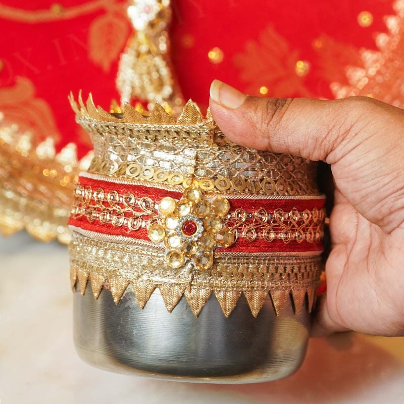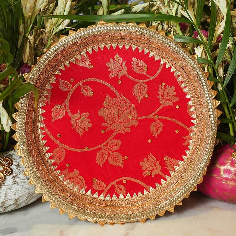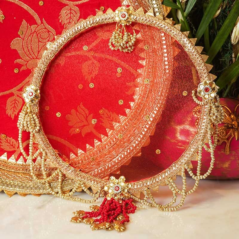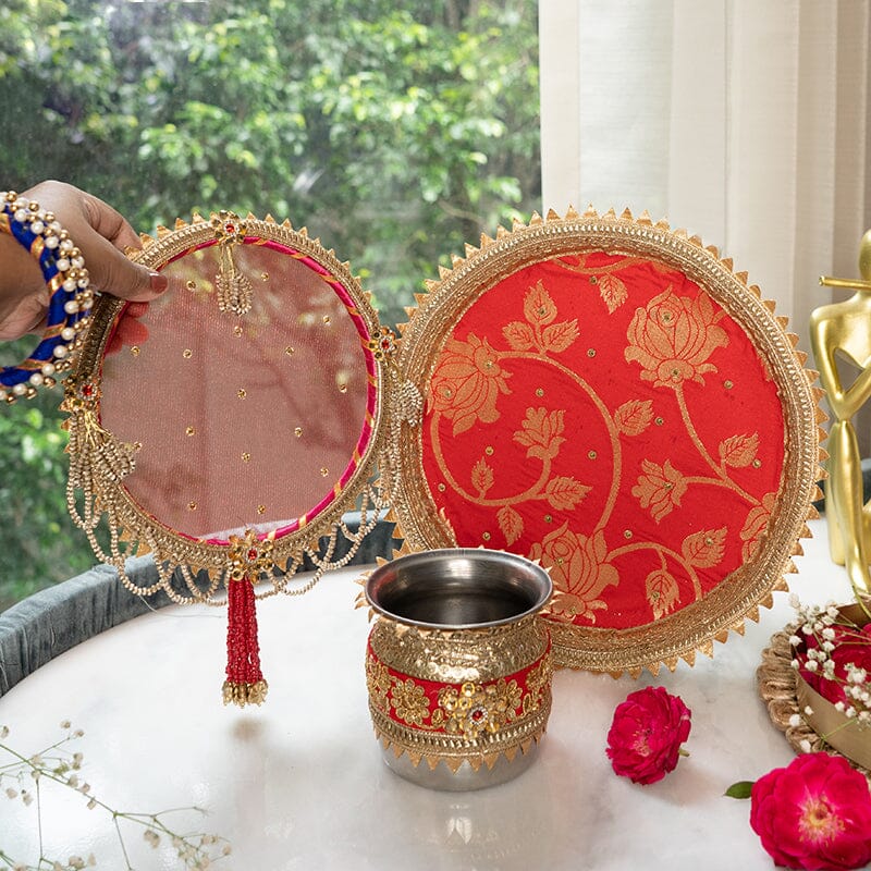 Unlock the secrets of lavish royalty with the luxurious Karwa Chauth Thali Set. Richly crafted from steel and coated in regal, red hues, this decadent set is the perfect way to honor the sacred tradition of Karwa Chauth. Let your inner bride shine as you bask in the divine elegance of this exquisite piece.