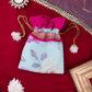 Known to be a woman’s one of the most favorite accessories, Potli is something that carries every single of your needs. Available in a gorgeous combination of sky-blue and bright pink colors, this exquisite petite floral Potli with attractive tassels, Gota Patti for bordering, and laces for decoration perfectly suit your outfits. Skillfully stitched to accommodate your belongings, this easy-to-carry Potli can also be gifted to your friends and relatives at Kitty Parties, as a Thanksgiving gift at weddings, housewarming ceremonies, Diwali, or any other functions.
