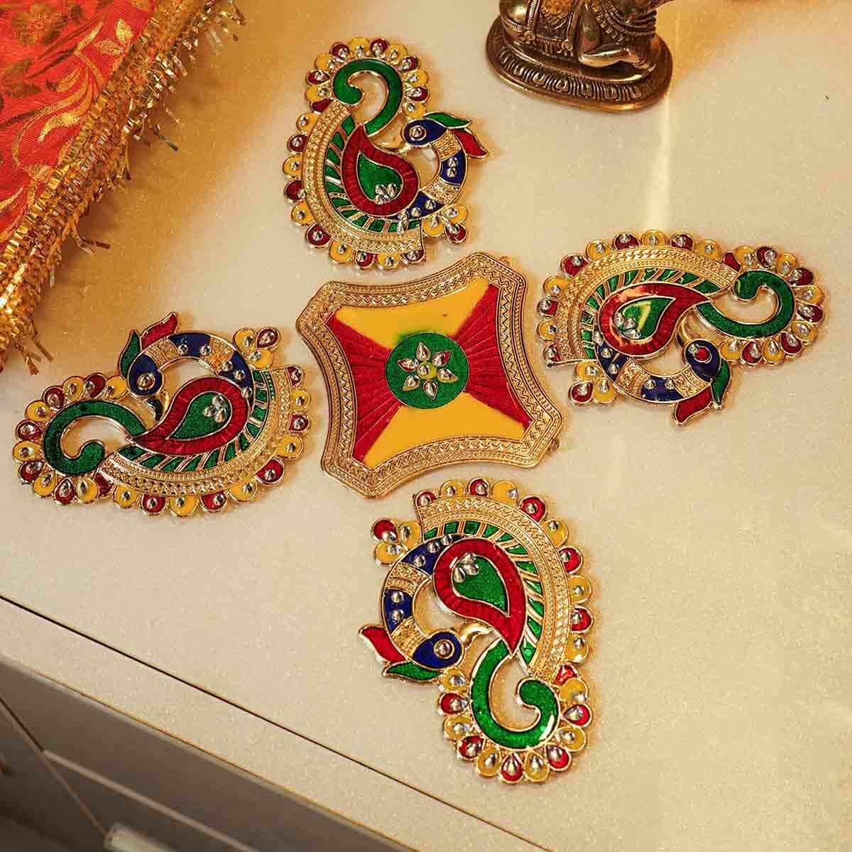 The Festive Peacock Acrylic Rangoli Set features a striking centerpiece accompanied by four large peacock-shaped side pieces. When arranged together, they form an elegant rangoli that captures the beauty and grace of the peacock motif. Crafted with a refined design sensibility, this set enhances your festive décor with a sophisticated blend of tradition and artistry.