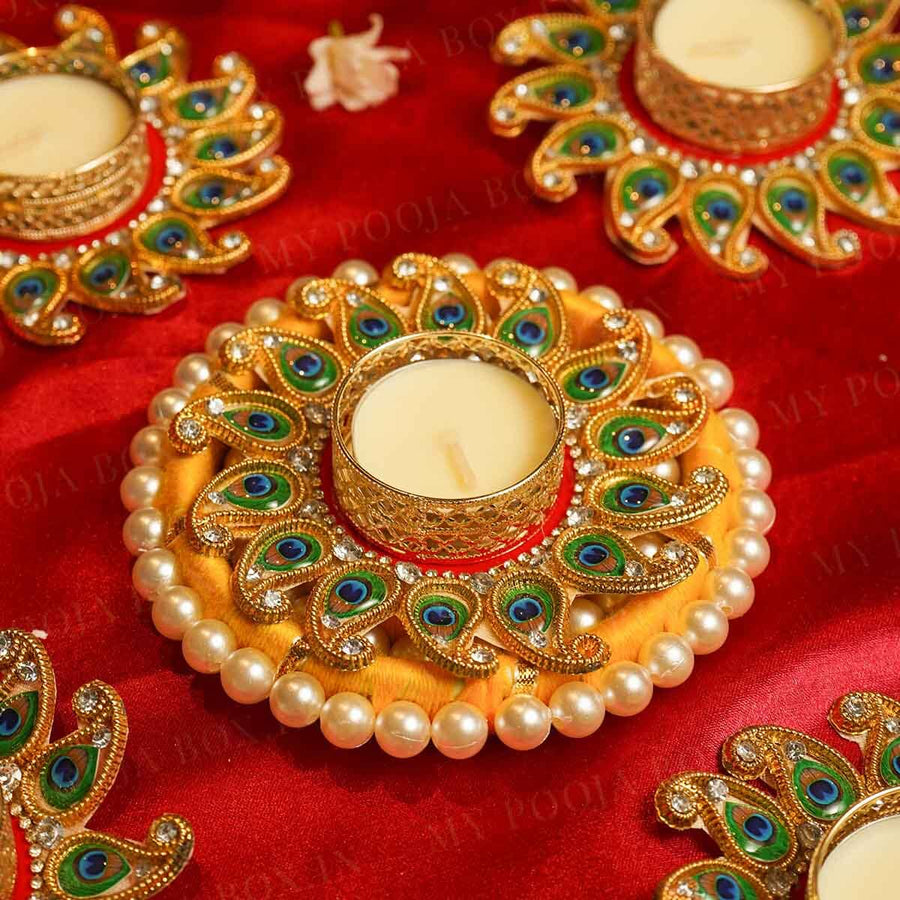 Enhance your festive celebrations with this sophisticated set of five beaded decorative diyas arranged in a rangoli design. Each diya features intricate beadwork that adds texture and a refined sparkle, creating an inviting and elegant ambiance for your home. Ideal for elevating traditional décor with a contemporary touch.