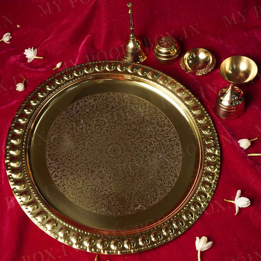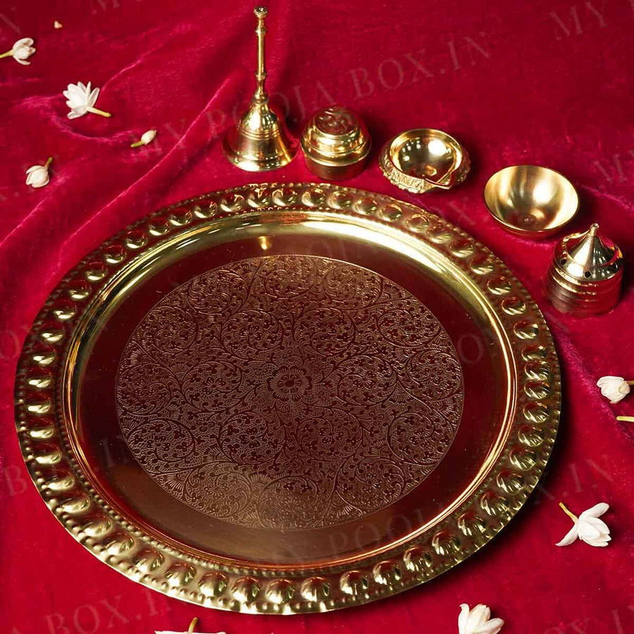 This Floral Ornate Brass Pooja Thali Set exemplifies superior metalwork with its intricate floral embellishments on premium brass. The meticulous hand-crafted details showcase traditional artisanship while providing optimal weight distribution for ceremonial stability. The natural brass composition offers exceptional durability and develops a distinctive patina over time, enhancing its aesthetic value. Each component is precisely proportioned according to ritual specifications, making this set both a functional worship implement and an authentic expression of devotional artistry.