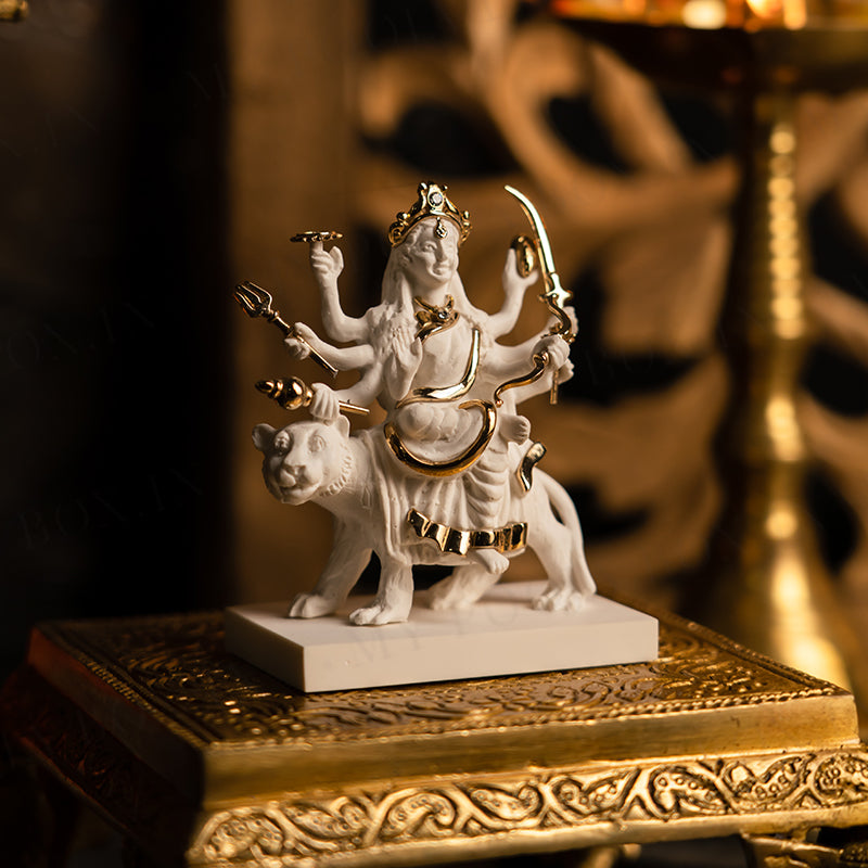 This mystical Sherawali Mata gold-plated marble idol by My Pooja Box with an antique finish looks very beautiful and is perfect for worship and home decoration. Its design looks traditional stylish, and inspired by the days of royal touch. This handmade marble item is an ideal gift for housewarming anniversaries, birthdays, wedding gifts, return gifts, corporation gifts, religious gifts & Indian festivals. Our collection of gold-plated marble idols is an impressive piece of art that is made from the finest grade raw materials and intricately designed by skillful designers and craftsmen.