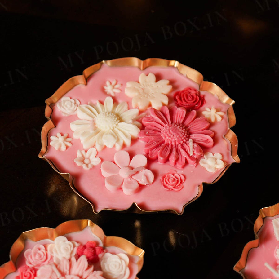 The Rose Floral Wax Candle Urli (Gold) features a lotus shaped aluminium base with an elegant brass polish, offering both durability and a refined look. Filled with fragrant Rose wax and adorned with delicate wax flowers in shades of pink on top, this candle serves as a stunning decorative piece—even unlit. Available in four sizes (3.5", 4.5", 5.5", and 6.5"), it is a sophisticated choice for gifting or enhancing your space with subtle floral charm.