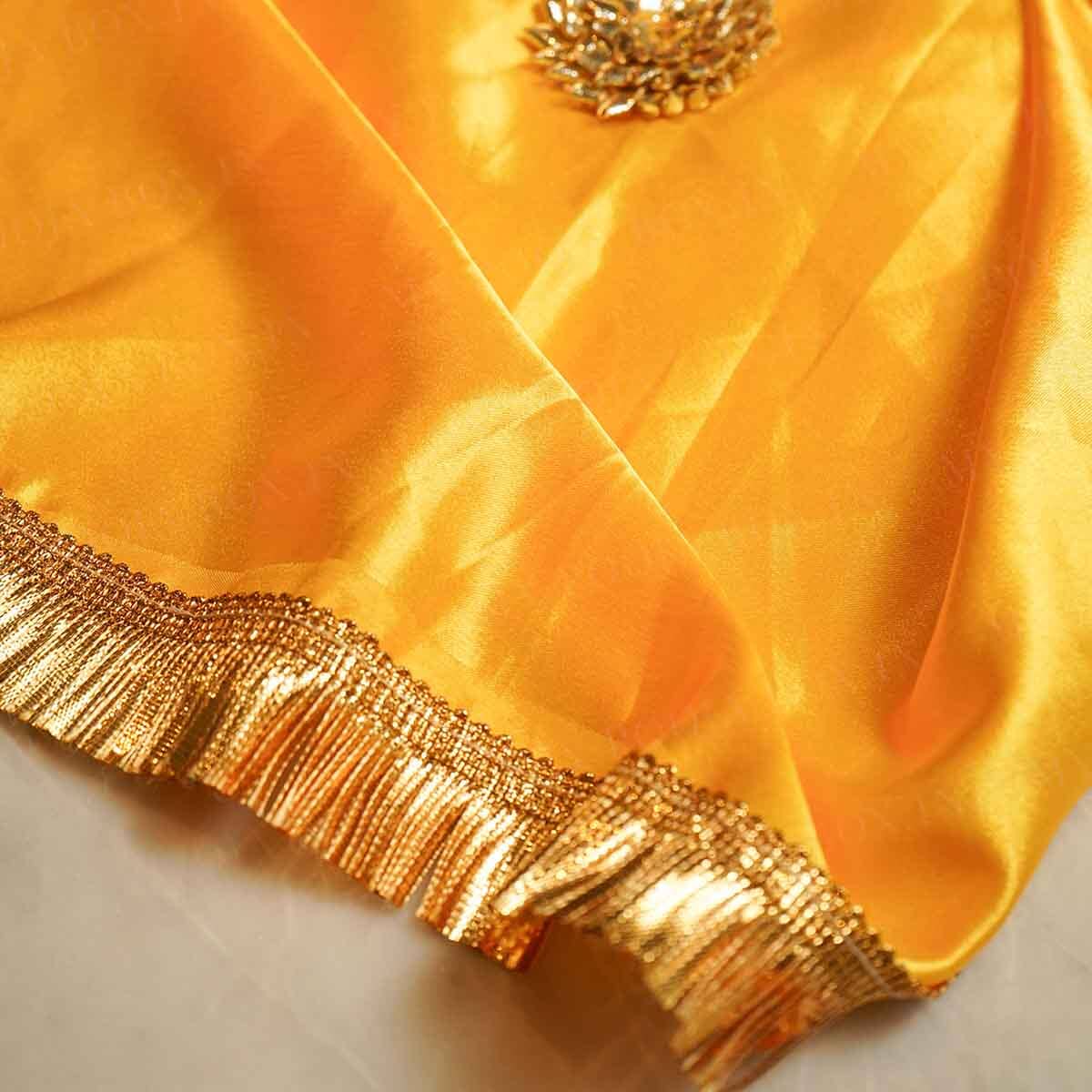 Celebrate Karwa Chauth in Style with the Royal Yellow Gota Patti Thali Cover from My Pooja Box. Crafted with intricate detailing and vibrant colors, this elegant thali cover adds a touch of beauty and charm to your puja thali. Perfect for safeguarding your sacred items while elevating the aesthetic appeal, it’s a must-have accessory for this auspicious festival.