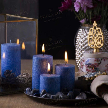 Add fragrance to your surroundings by lighting these beautiful pillar candles (set of 4). Available in this beautiful design and in a set of four, these candles are best to be lit on a special occasion to create a dazzling atmosphere around. Place them in your living room or puja room, they are sure to elevate the aesthetics nearby!