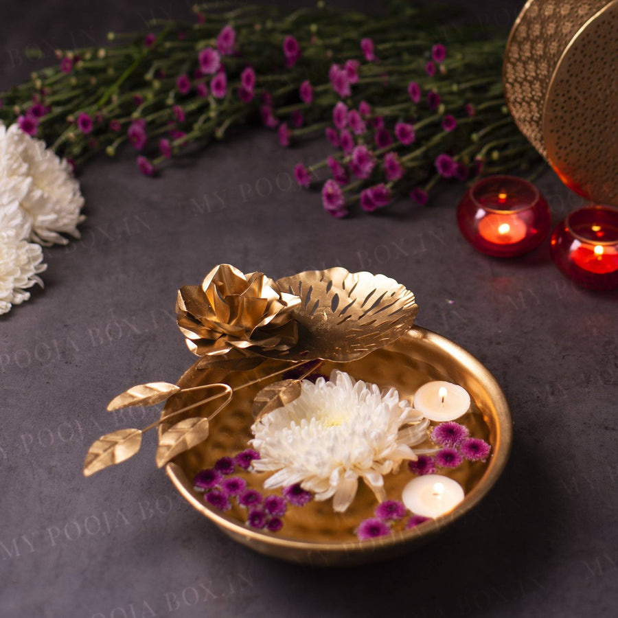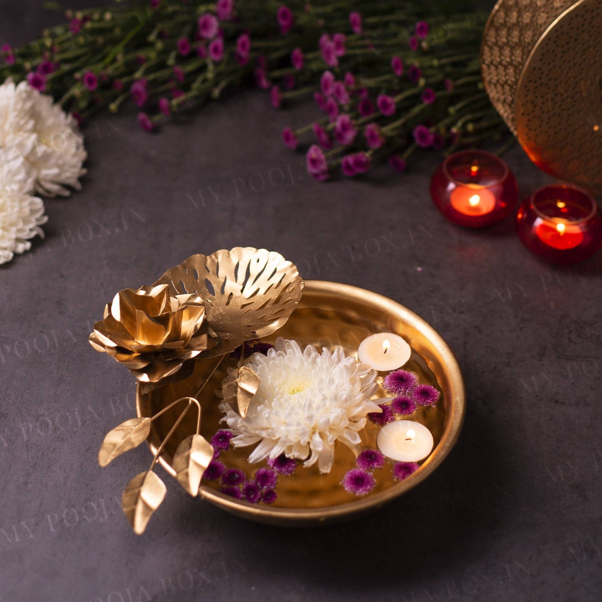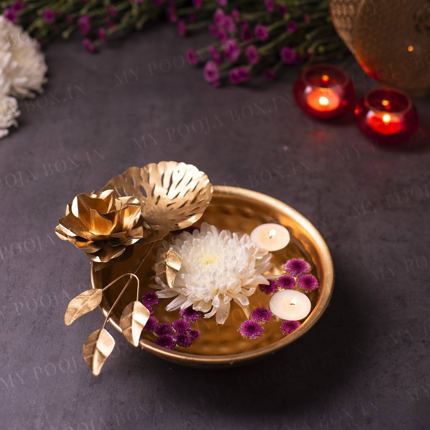 Elevate your decor with this Shiny Stylish Verdant Urli With T-light and bring a touch of luxury to your space. Available in three sizes, this golden-coloured Urli features a golden flower with leaves on edge, giving your living space an elegant look. Crafted from high-quality metal, this Urli has a shiny finish, providing a luxurious look and feel. The accompanying T-light adds a warm and cosy ambience, making it the perfect centrepiece for gatherings and events. Whether you wish to decorate your home or give a thoughtful present to a loved one, the Shiny Stylish Verdant Urli with T-light will impress.