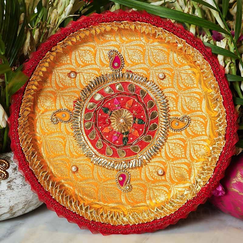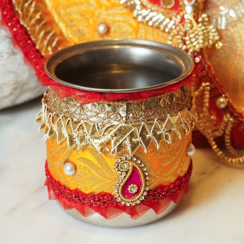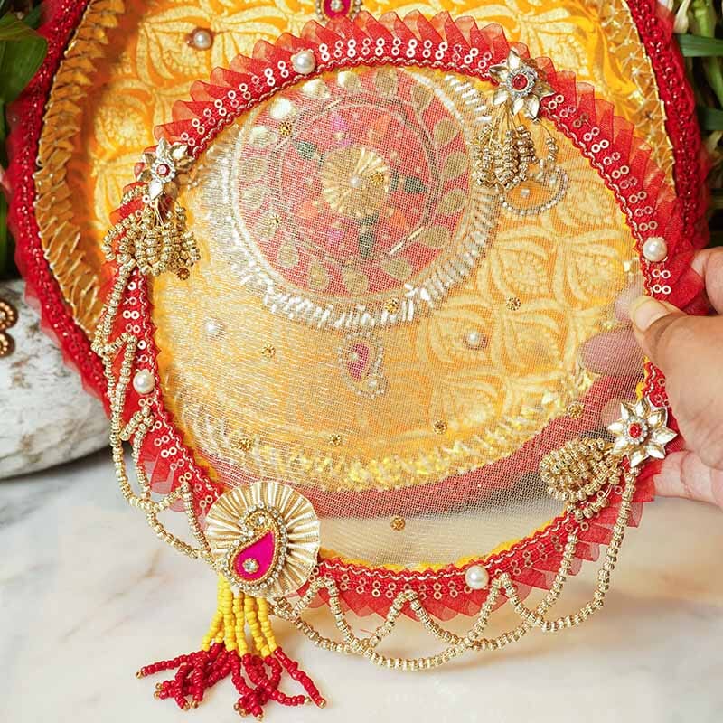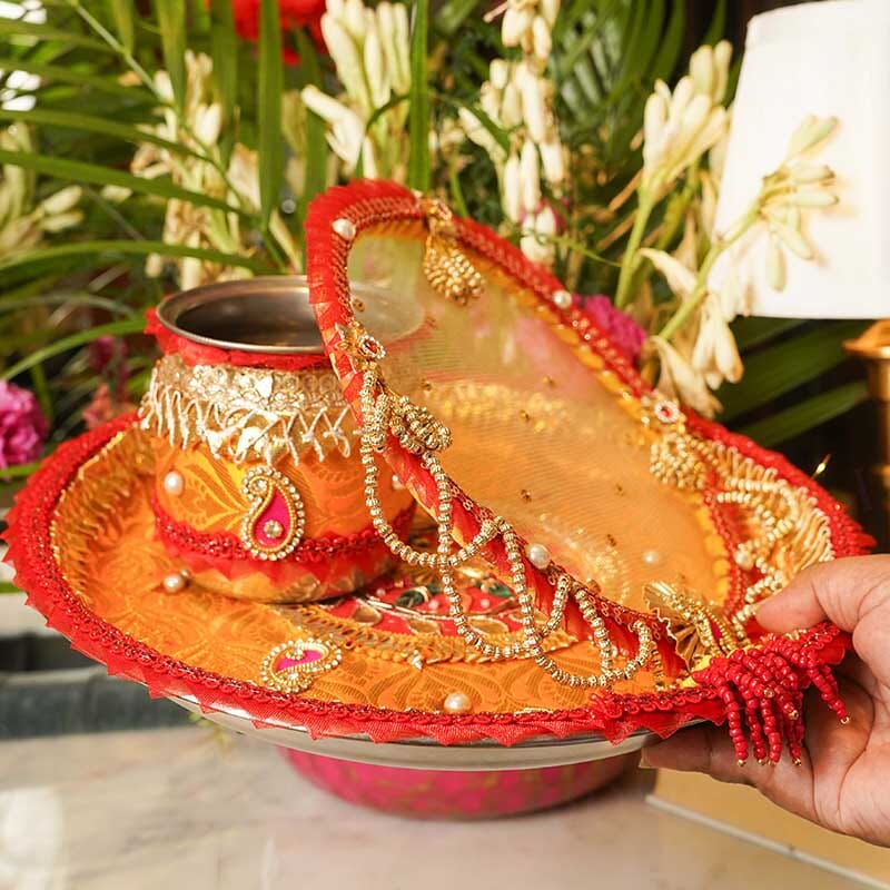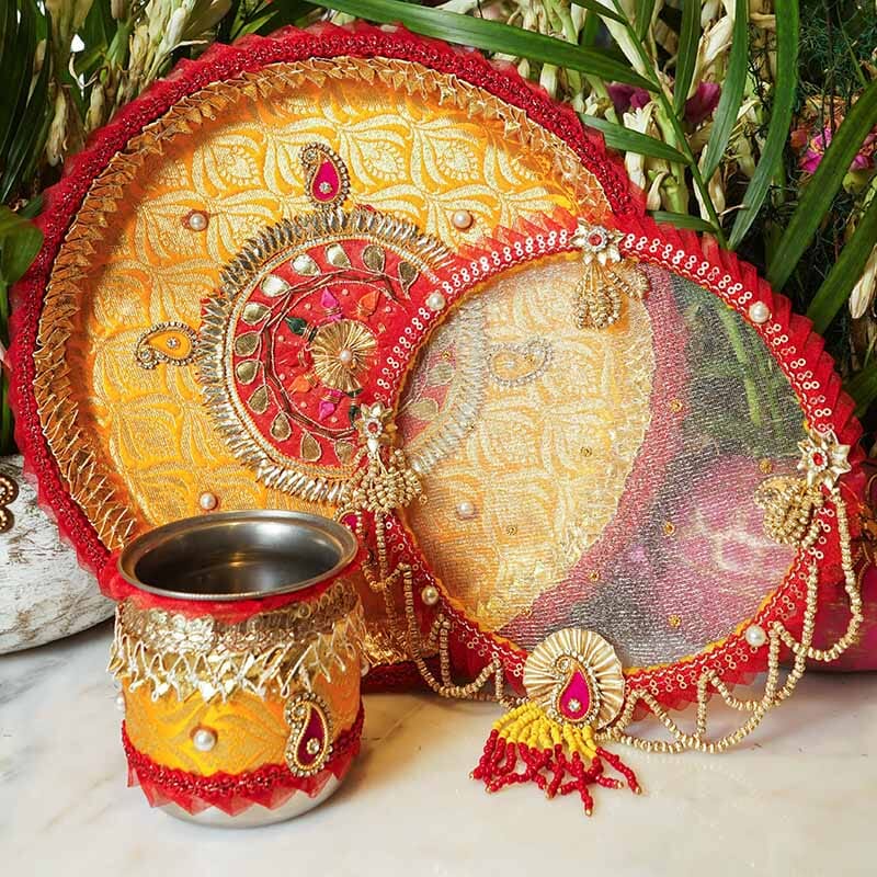 This Suhagan Karwa Chauth thali set is the embodiment of celebration - its exquisitely crafted gold-painted design will overwhelm your senses. Every intricate detail of this set exudes artistry and makes this the perfect gift to mark the occasion. Perfect for honoring the bond between a husband and wife, this set is sure to be cherished for years to come.