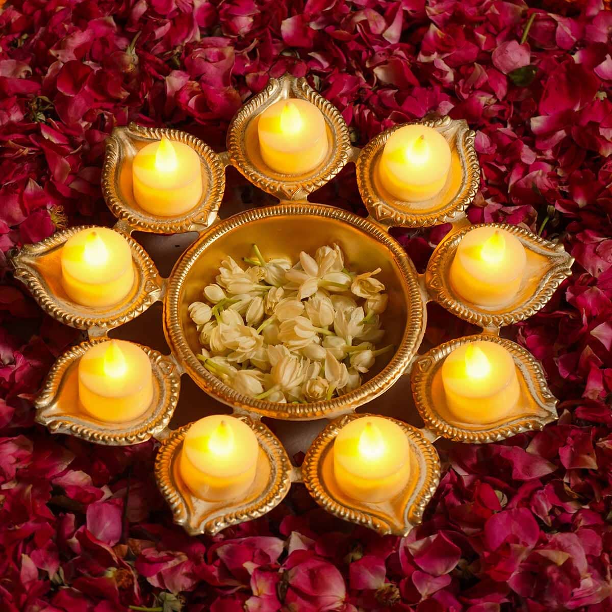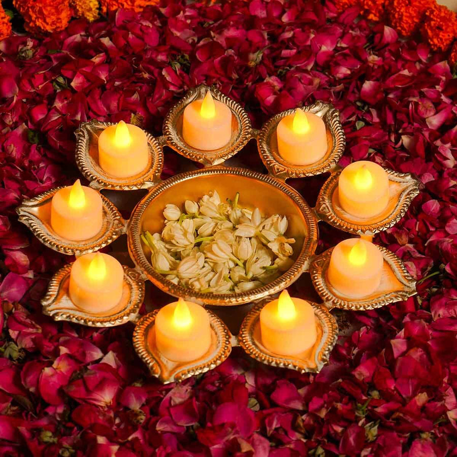 The White Gold Small Urli with Swastik Design combines traditional symbolism with elegant craftsmanship. Its compact size makes it ideal for sacred rituals and decorative displays. Crafted with a white gold finish, it offers durability and a refined appearance. The swastik motif, a symbol of auspiciousness and prosperity, enhances the spiritual significance of this urli, making it a meaningful addition to any pooja or festive setting.